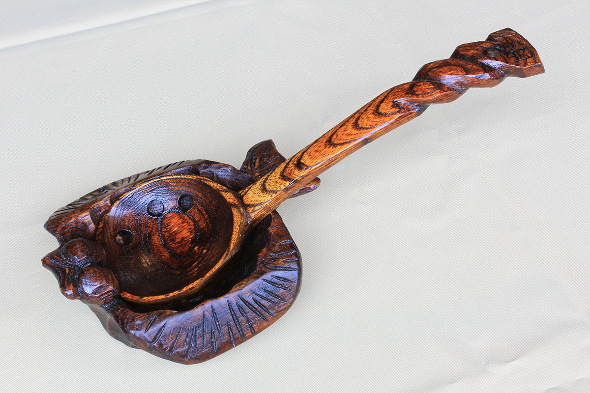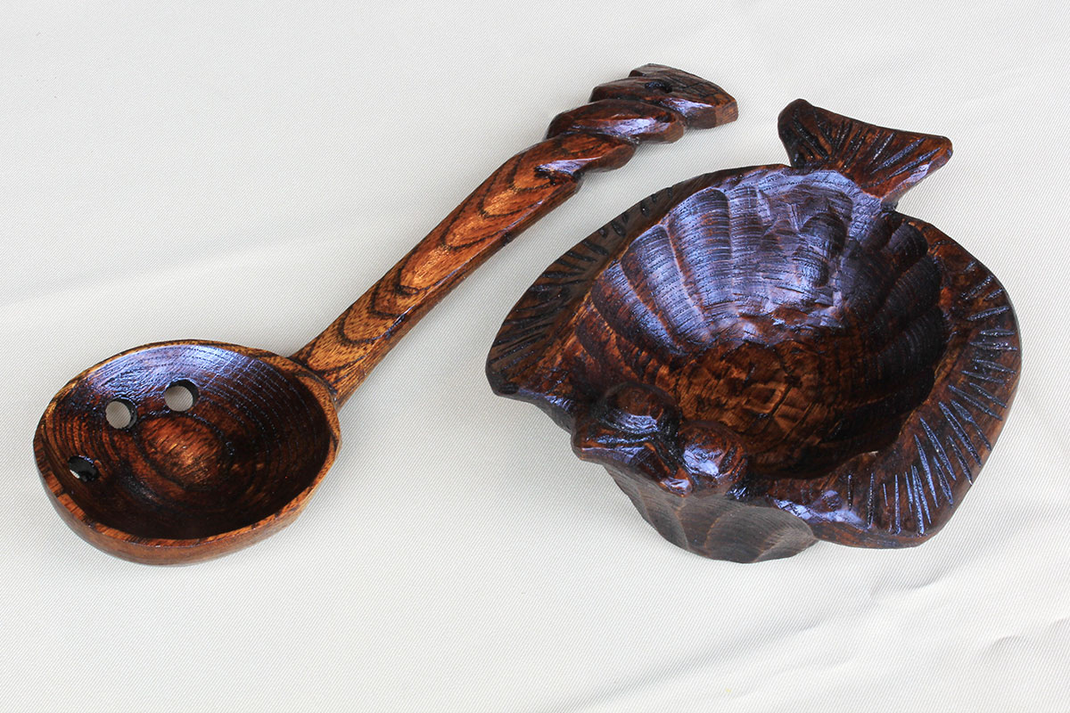 鍋物用 柄彫り 柄曲り半穴お玉 ひらめ受け台付きセット