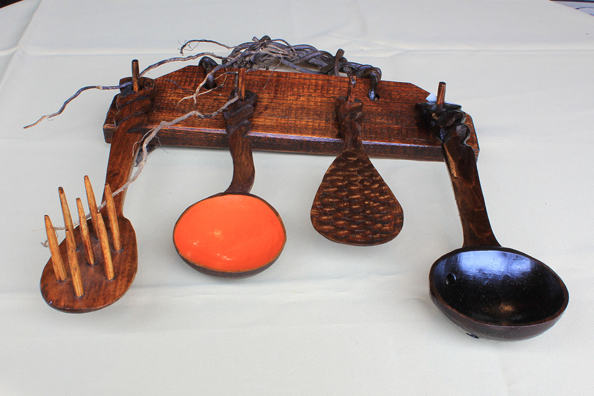 - 吊り台がついた、4種キッチン用品セットです。天然素材の物なので、1つ1つ多少違ってきます。飯しゃもじにには、乱れ彫り入りです。