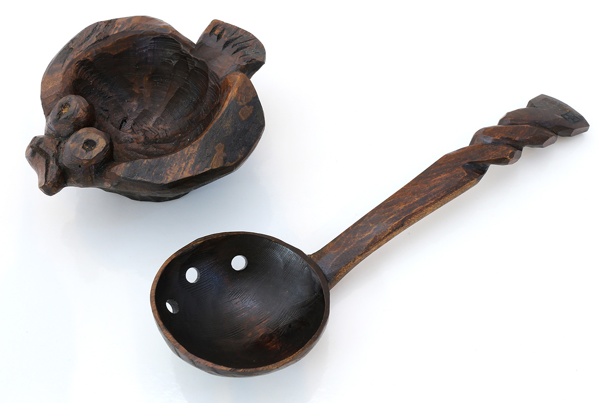 鍋物用 柄彫り 柄曲り半穴お玉 ひらめ受け台付きセット