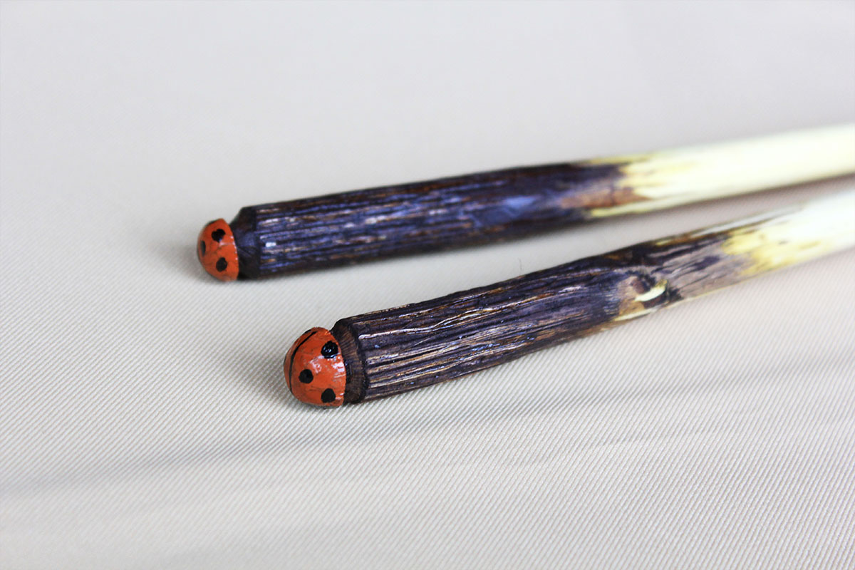 - 粘りのある南天の木を使った、箸。持ち手の先には、てんとう虫をあしらったデザインでとてもかわいらしく仕上がっています。